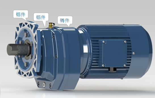 (1)、輕量化設計 本款減速機首次采用鋁件(法蘭與箱體)與鑄件(端蓋)相結合的設計理念(如圖1),在保證強度的情況下,大化的減輕整機重量,使整機重量降至21KG(以接0.75KW電機為例)。同時端蓋采用鑄件材料能有效的揮發出高速級所產生的熱量,促使整機溫度平衡。